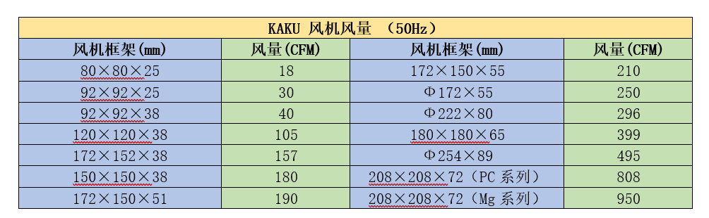 下表列出市場上比較常見的卡固(KAKU)風機的數據,作為我們上面例子的風機選型參考。