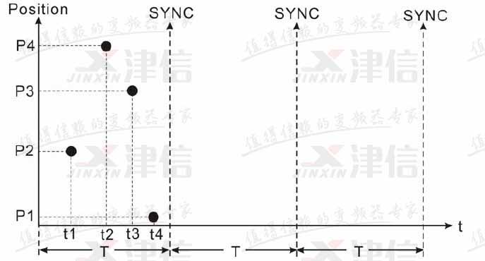 10MC 接有四臺伺服驅(qū)動器,T 為同步周期。在同步周期內(nèi),四臺伺服驅(qū)動器分別在不同的時刻(t1、t2、t3、t4)接受到控制數(shù)據(jù),但是控制數(shù)據(jù)并沒有生效。當(dāng)伺服驅(qū)動器接收到同步信號(SYNC),控制數(shù)據(jù)同時生效。