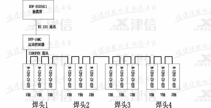 目前市場上以單焊頭超音波焊接機(jī)為主,但是單焊頭存在占用場地,效率低等缺點(diǎn),所以上海津信為客戶推出了以臺達(dá)10MC11T和ASD-A2-0421-M型伺服驅(qū)動器為主開發(fā)的4焊頭超音波焊接機(jī)。