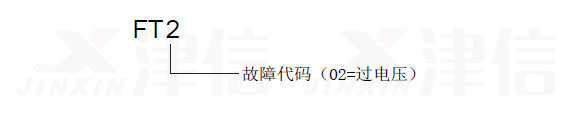 當偉肯變頻器出現故障時,偉肯變頻器會停止運轉,并且在顯示器上以如下的格式閃爍顯示符號FT 和故障代碼。例如: