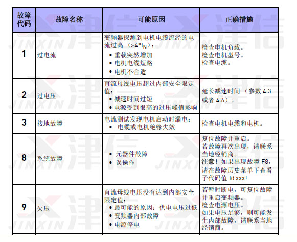 偉肯變頻器的故障和時間記錄存儲在故障歷史子菜單內,用戶可以瀏覽該菜單。下表列出了不同的故障代碼及其發生原因和更正措施。